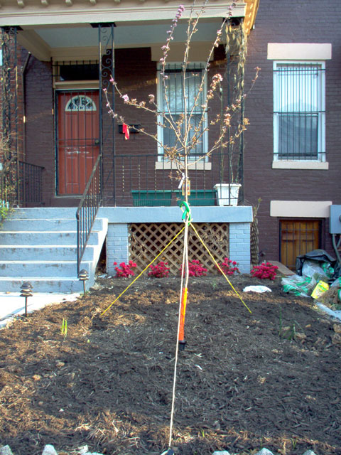 Mulch has been spread over the whole yard, lighting installed, and the azaleas are in bloom.