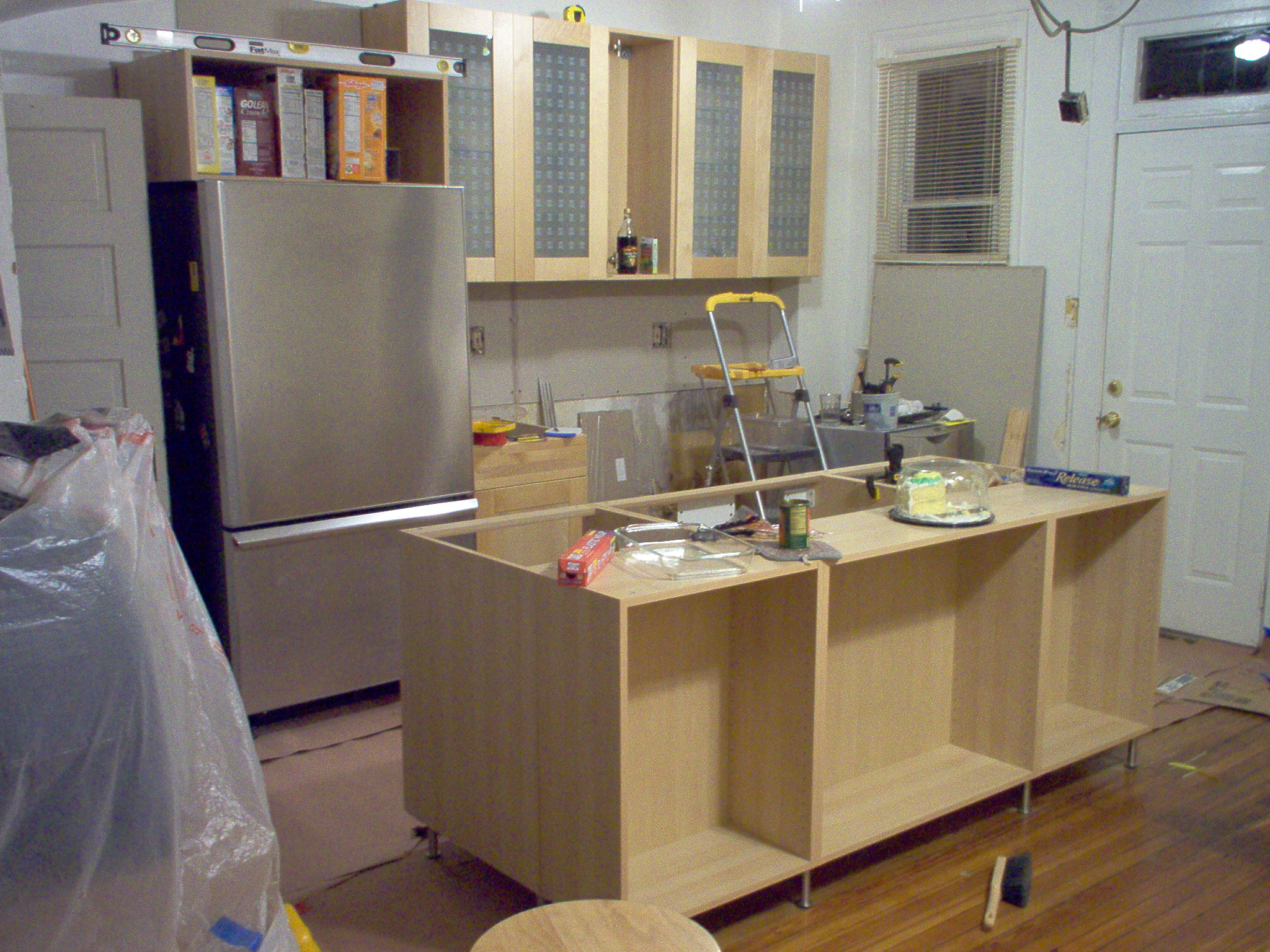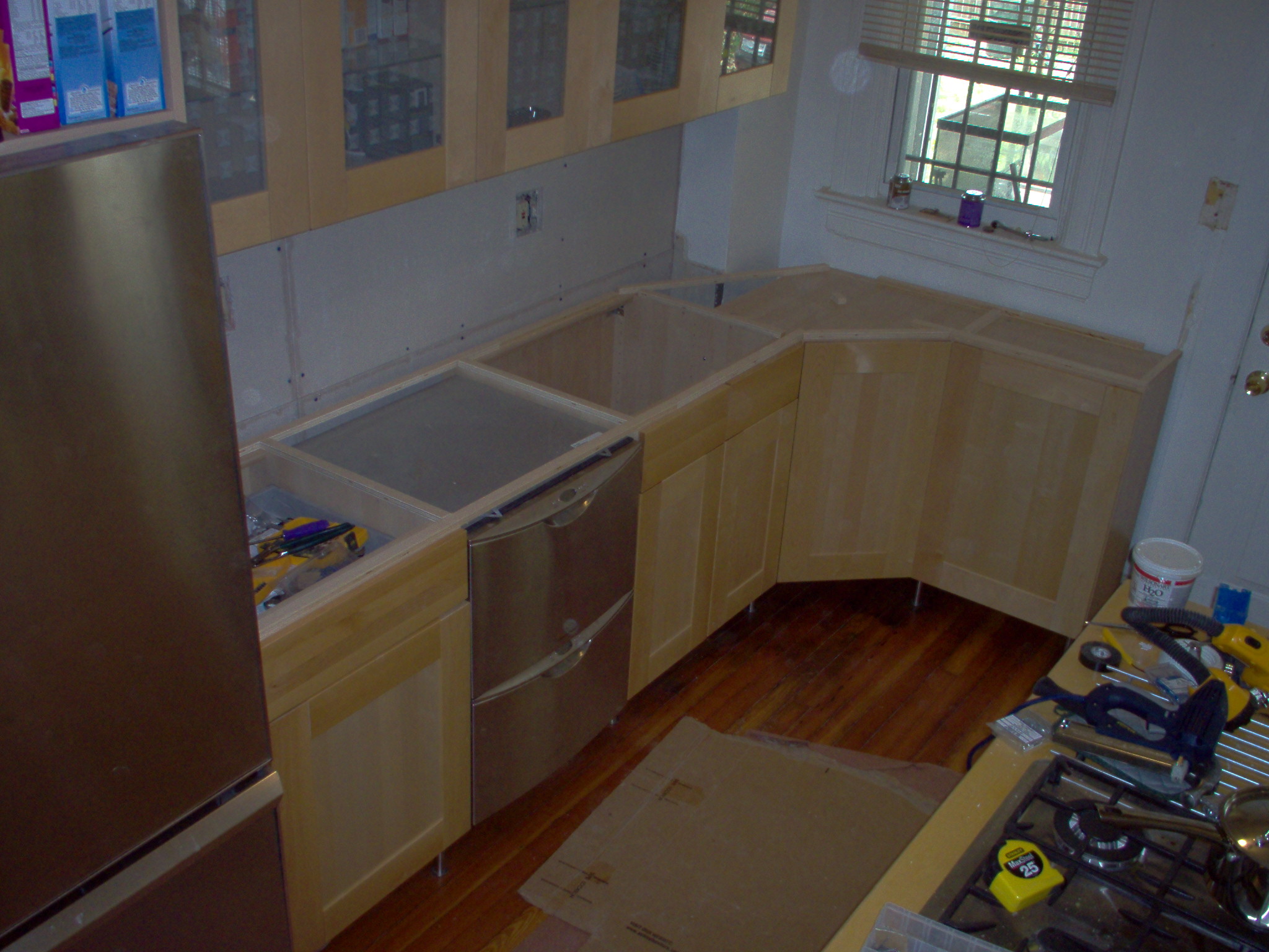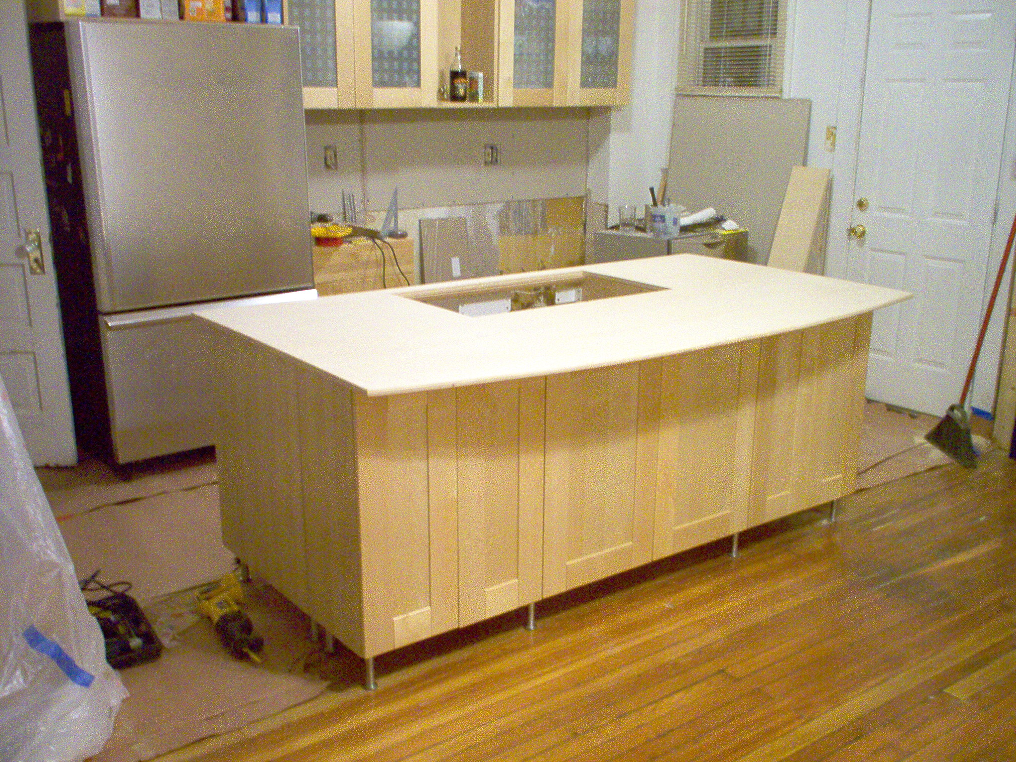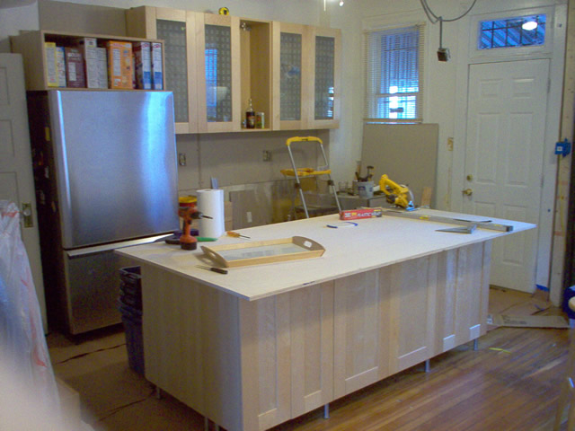 All of the doors on the dining room side of the island have been installed and the top has been placed on. The countertop still needs to be trimmed, edged, and sealed |