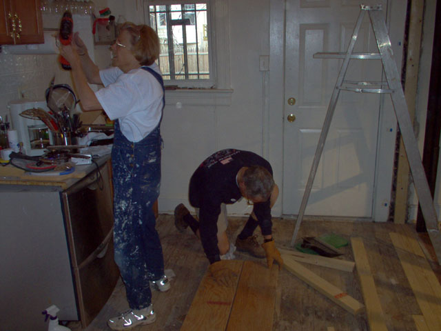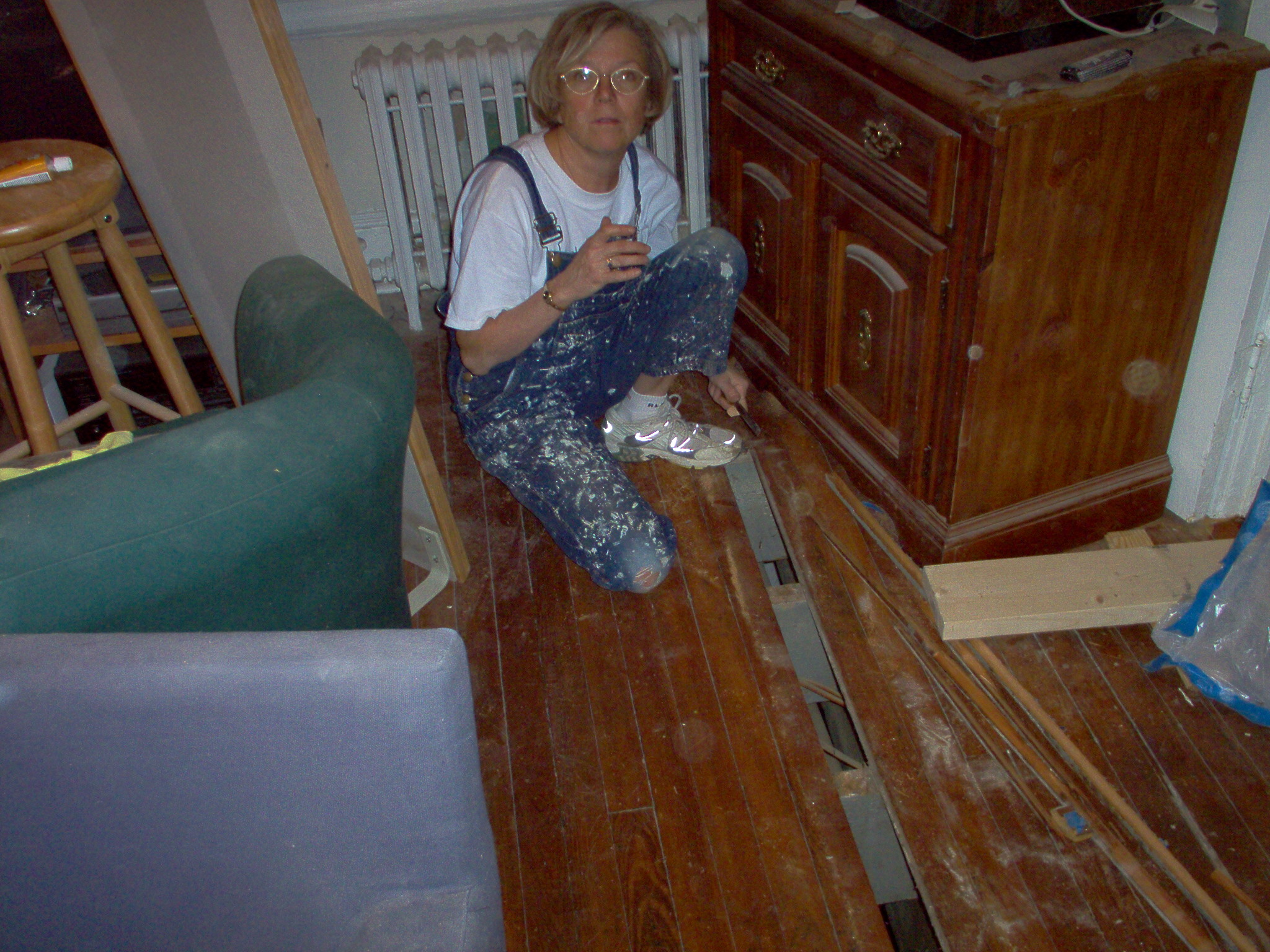 | Mom cleans up the wood around where we removed a damaged floor board before we replace it. |