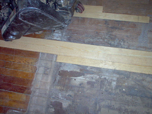 | This shows the difference between the new floor boards we installed, the old unfinished boards under the vinyl floor we removed, and the previously finished boards. |