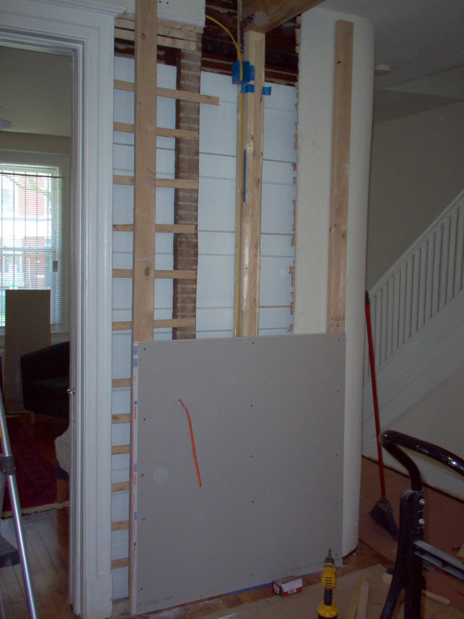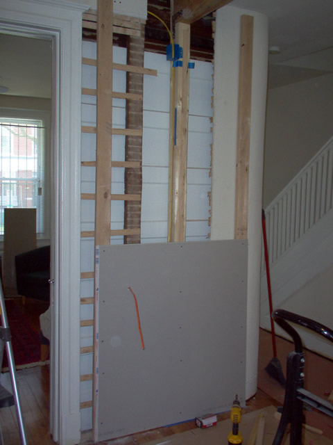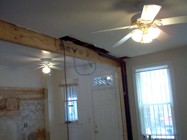 | This is the header we installed. Fabricated out of 2 1.75x9.25 GPLam LVL boards bolted together Simpson Strong-Tie SDS screws. This supports the load the old wall previously held. |