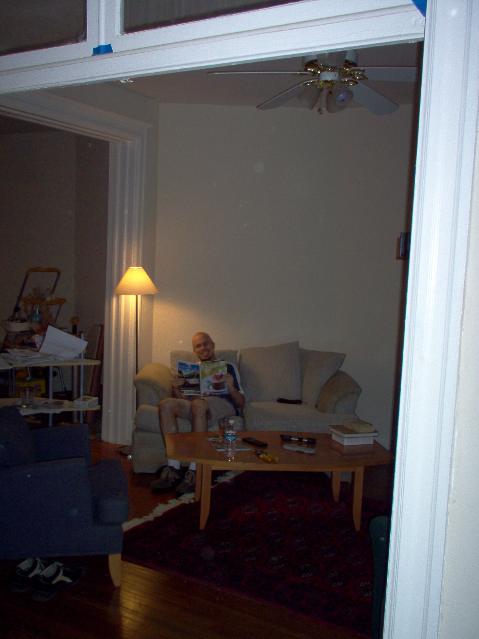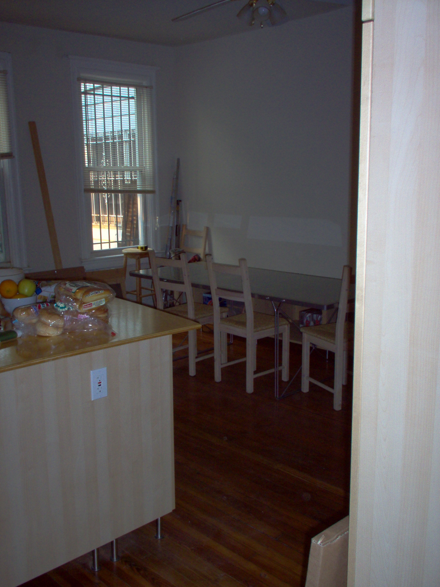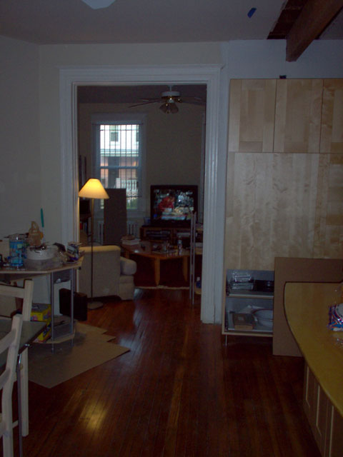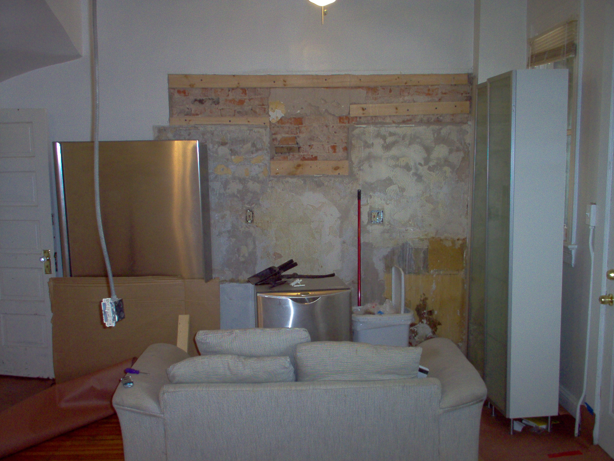 | The kitchen once all the cabinets were removed and the sofa was moved into it so that the other side of the floor oould be refinished. |